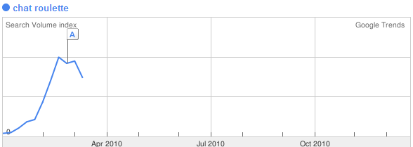 Chat Roulette seems to be the social platform of the moment with countless mentions across the twittersphere, blog networks (including this one now!) and a Google trends chart which is pretty impressive.
